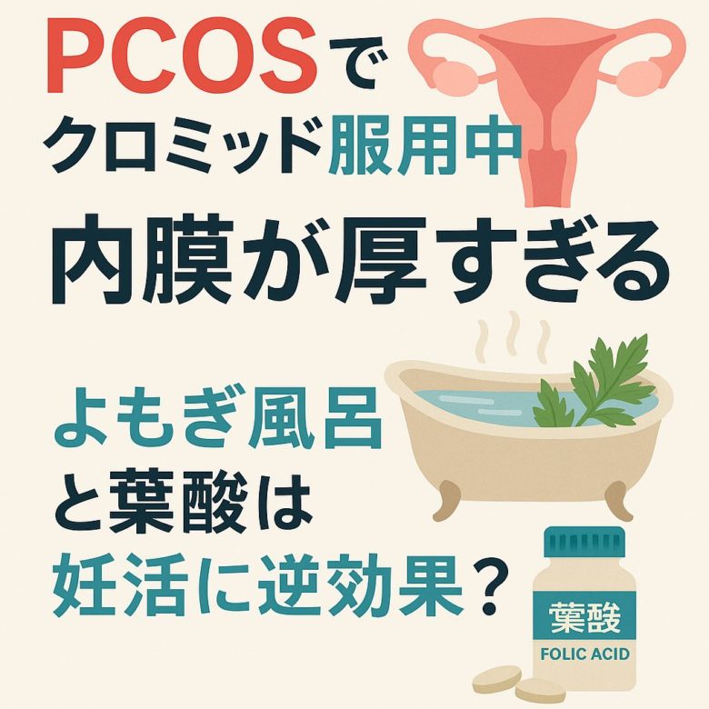 今回は、「PCOSでクロミッドを服用していると子宮内膜が厚くなりすぎるのはなぜか?」という視点を中心に、よもぎ風呂や葉酸との付き合い方まで、わかりやすくお伝えしていきます。